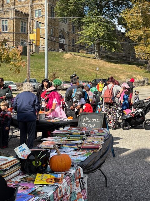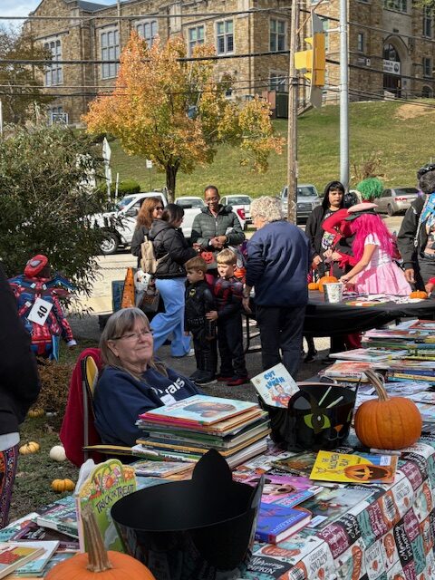 The children gathered at the Sheraden United Methodist Church parish house and received their numbers for costume judging. They paraded along Chartiers Avenue to the community pavilion. There they marched past the judges according to their various age groups and proceeded thru the line of tables where they picked up treats from the various community groups, businesses and neighbors. The children picked out a few books for their personal library and made a book marker for them.